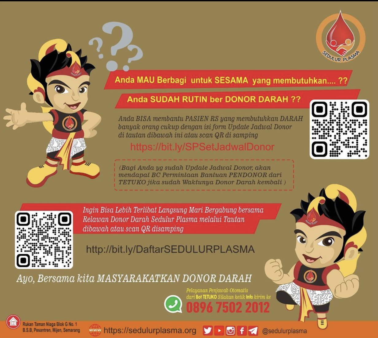 Tentang TETUKO Tetuko adalah nama kecil Gatotkaca, yaitu tokoh wayang yang dikenal bisa terbang. Dia adalah putra Bima atau Werkudara. Ist. Saat masih bayi, Tetuko diterjunkan ke dalam kawah Candradimuka. Bot chat WhatsApp adalah program kecerdasan buatan AI (artificial intelligence) yang dimiliki oleh WhatsApp Business API. Sistem bot ini mampu berperan sebagai asisten virtual yang membalas setiap pesan WhatsApp secara otomatis dalam hitungan detik. TETUKO SEDULUR PLASMA Giat pelayanan Sedulur Plasma Lahir saat kondisi Pandemi COVID-19 mencapai Puncak Tertinggi di bulan Juli 2021 di kota semarang. Tepat pada tanggal 17 Agustus 2021 lahirlah TETUKO Bot WA Penjawab Otomatis untuk mendukung Pelayanan Sedulur Plasma. Di Usia yang masih belia,diharapkan TETUKO dapat membantu lebih banyak Sedulur yang membutuhkan.